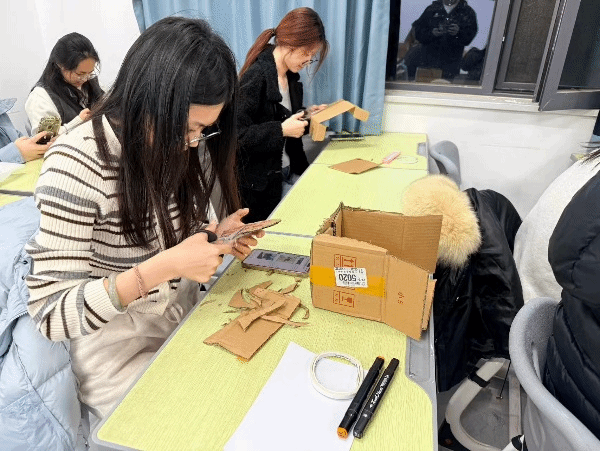 活动围绕“废物减量、资源循环、创意实践”展开,通过观看手工教学视频和动手实践,引导学生将日常废弃物转化为实用物品。现场气氛热烈,参与者分工协作,利用纸箱、瓶盖、旧布料等材料,制作出收纳盒、装饰画、环保袋等创意作品,展现了同学们的创新思维与动手能力。
